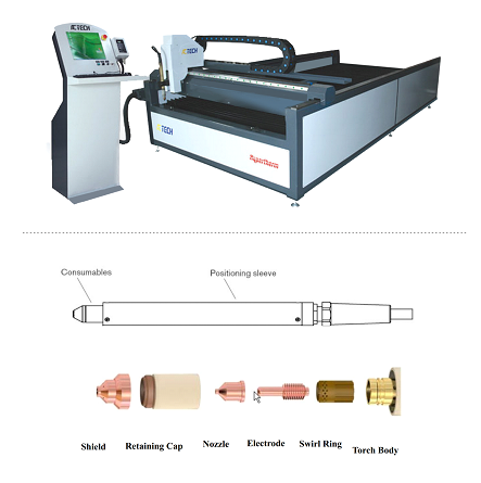 The Torch serves as the holder for the consumable nozzle and electrode, and provides cooling (either gas or water) to these parts. The nozzle and electrode constrict and maintain the plasma jet.