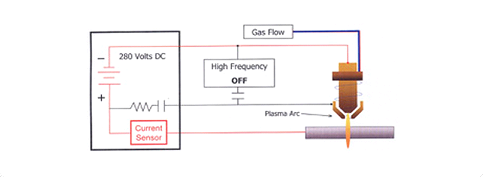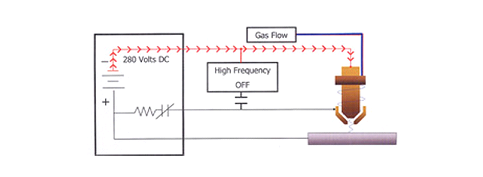 Assuming that the nozzle is within close proximity to the workpiece, the pilot arc will attach to the workpiece, as the current path to positive (at the power supply) is not restricted by a resistance as the positive nozzle connection is. Current flow to the workpiece is sensed electronically at the power supply. As this current flow is sensed, the high frequency is disabled and the pilot arc relay is opened. Gas ionization is maintained with energy from the main DC arc.
