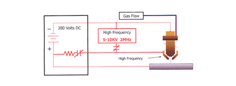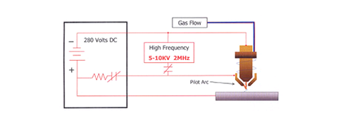 After the gas flow stabilizes, the high frequency circuit is activated. The high frequency breaks down between the electrode and nozzle inside the torch in such a way that the gas must pass through this arc before exiting the nozzle. Energy transferred from the high frequency arc to the gas causes the gas to become ionized, therefore electrically conductive. This electrically conductive gas creates a current path between the electrode and the nozzle, and a resulting plasma arc is formed. The flow of the gas forces this arc through the nozzle orifice, creating a pilot arc.